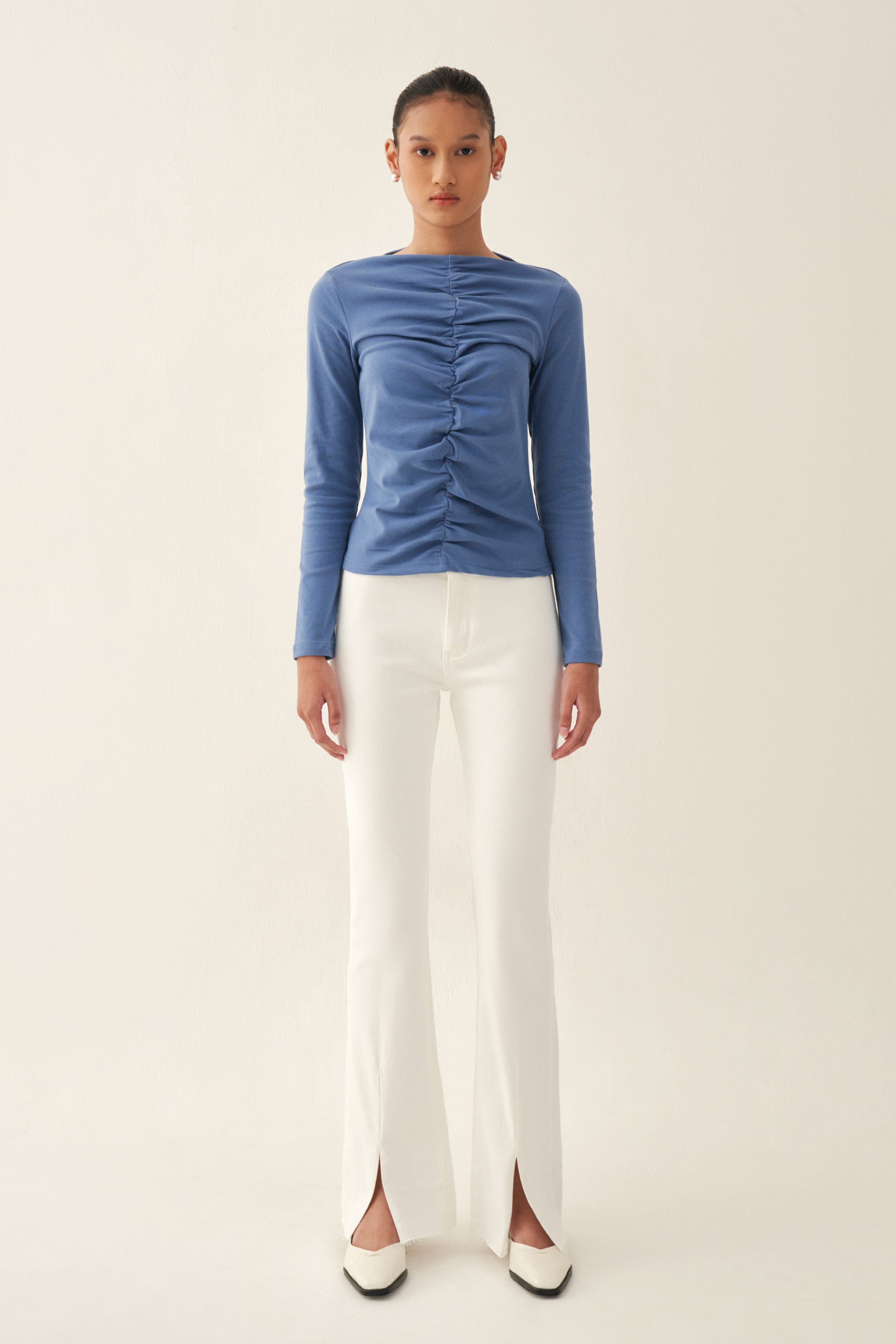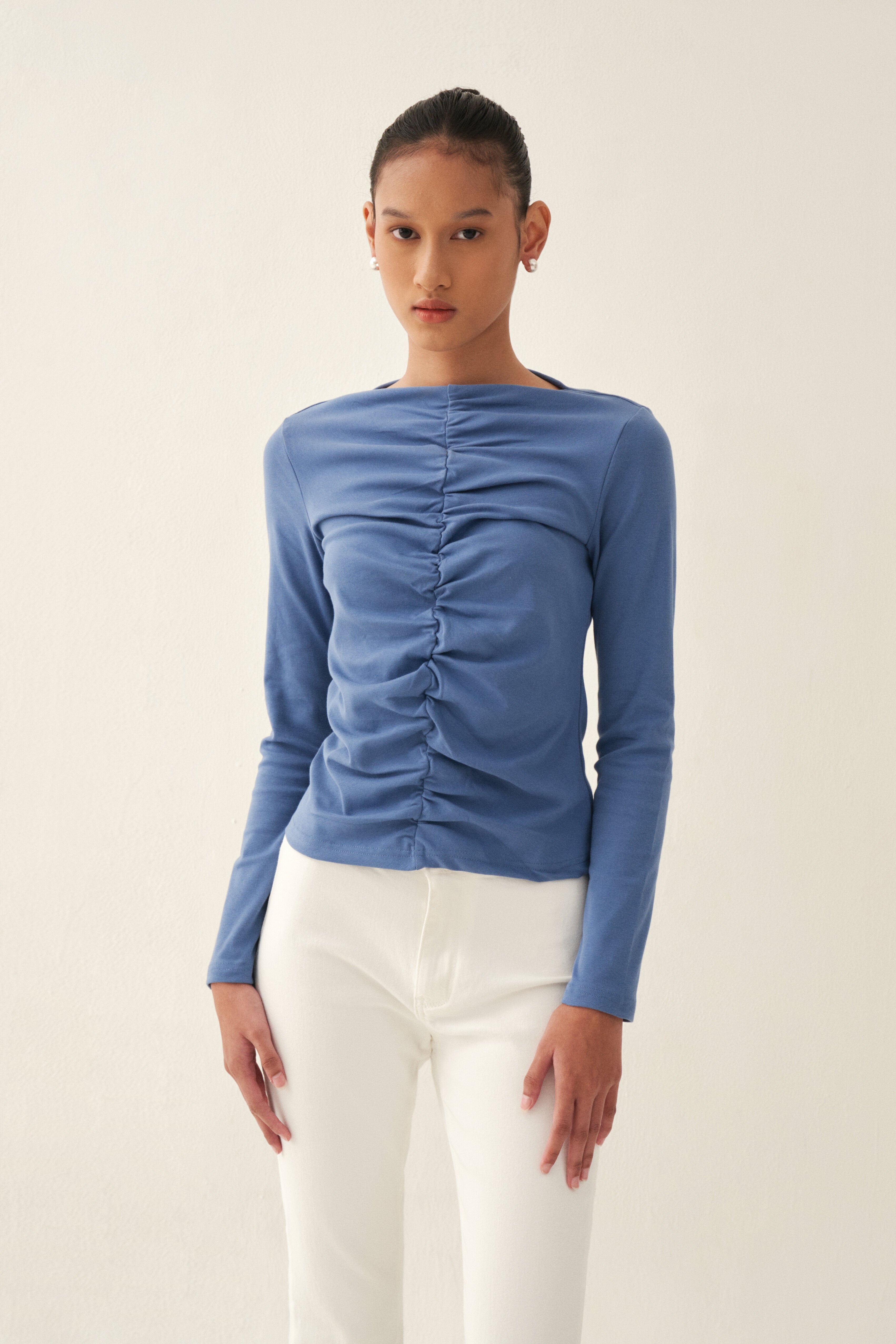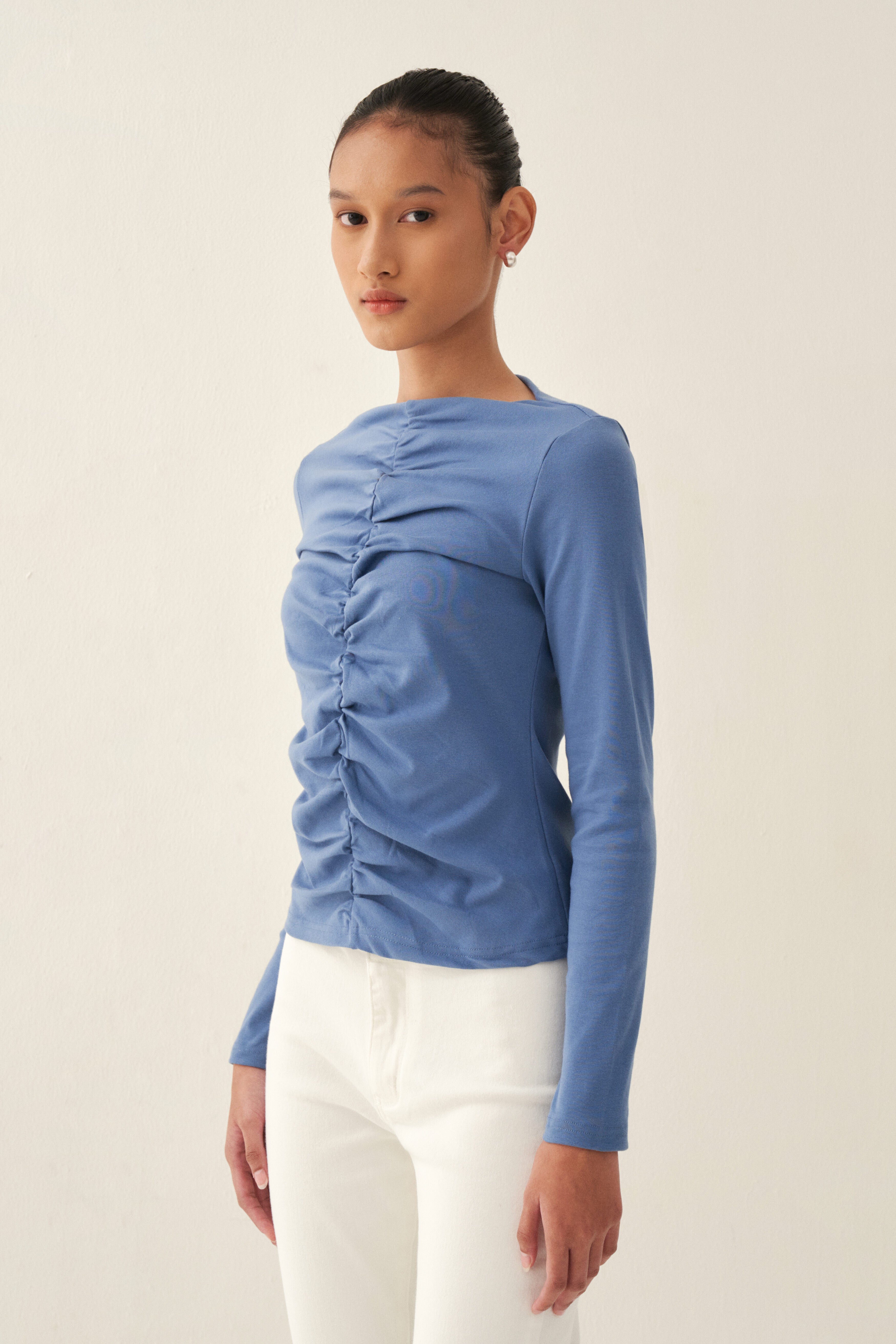 A fitted, long-sleeved top features a prominent ruching detail running vertically down the center. This ruching creates a textured, gathered effect, adding visual interest and dimension to the minimalist design.